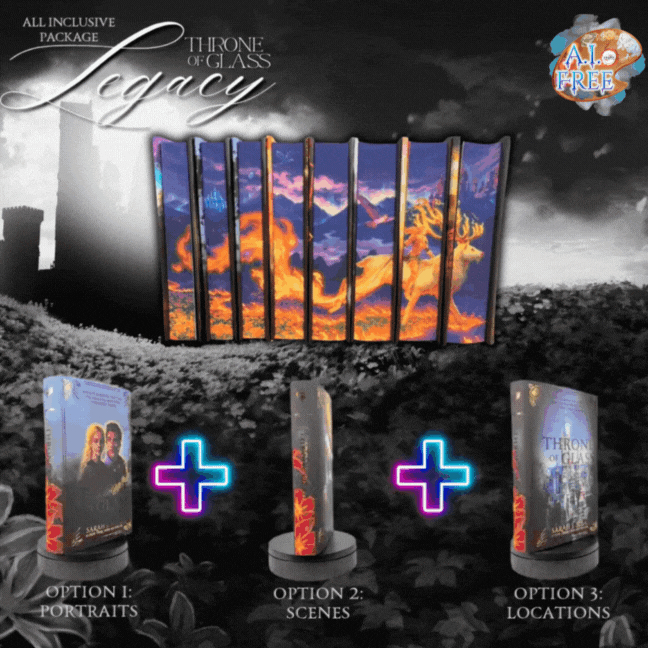 ✨All 8 New US Standard Hardcover books within the Throne of Glass series featuring 3-sided full color, digitally printed pages (PLEASE NOTE - THIS PACKAGE ONLY INCLUDES 1 SET OF BOOKS + 3 DUST JACKET OPTIONS THAT YOU CAN CHANGE WHENEVER YOU'D LIKE)